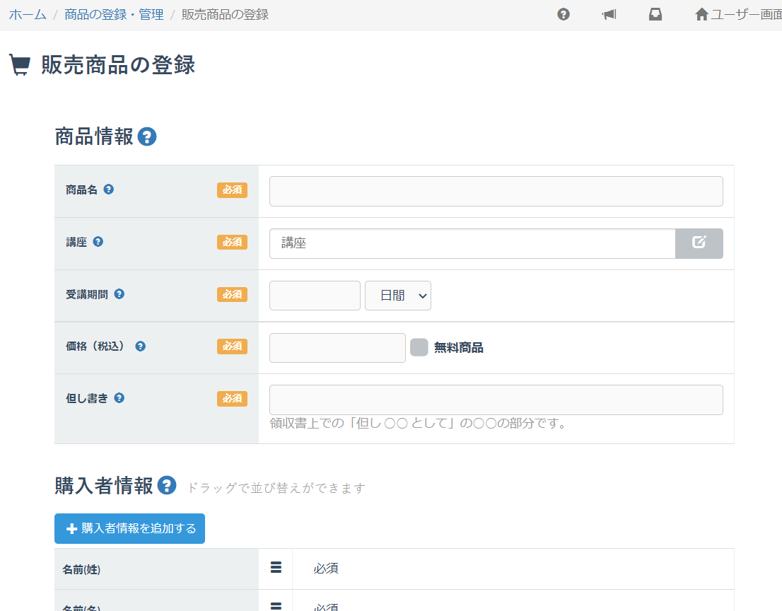5.購入の際に入力、選択する項目を自由に設定できるようにいたします。ユーザーの入力を必須にするか、任意にするかも設定できます。