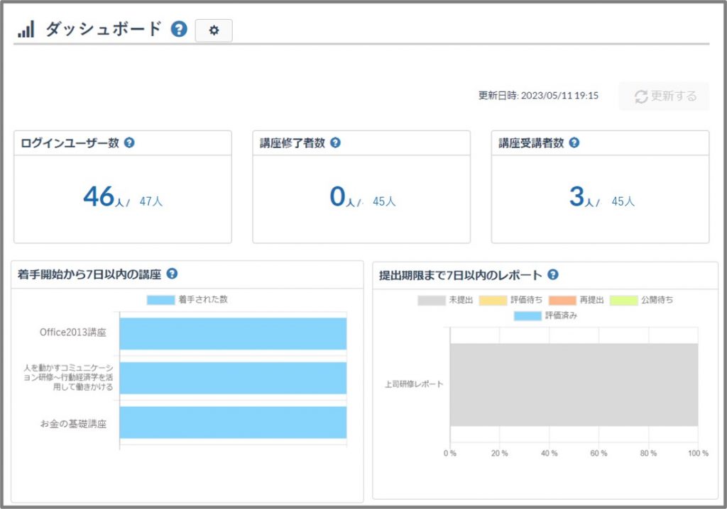 ログインユーザー数・講座の受講者数・修了者数といった受講者の行動や、お知らせ・アンケート・レポートの回答状況を一目で把握できるダッシュボード機能をリリースします。