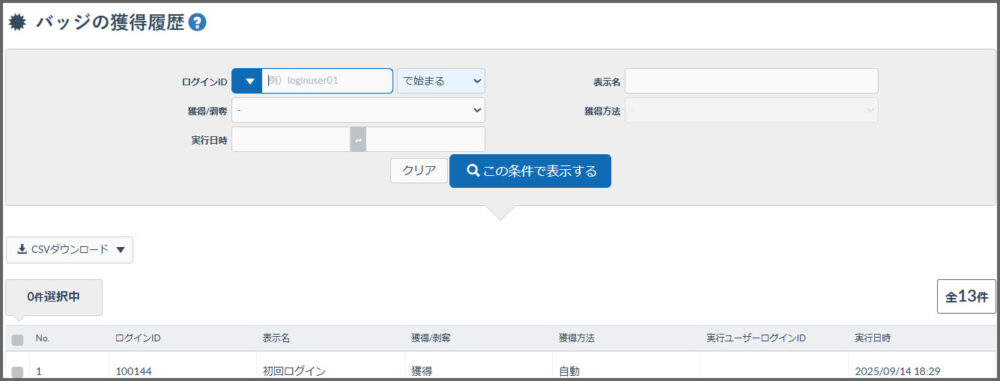 バッジの登録・管理、ユーザー別のバッジ獲得状況、バッジの獲得履歴、エキスパートユーザー一覧、それぞれの画面においてCSVダウンロードができるようになります。