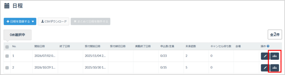 表示区分「申込受付ユニットに表示する」を選択した場合、管理画面から参加者を追加・確認する動線が変更されます。