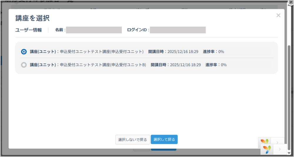 従来、講座に申込受付ユニットを登録し、講座の受講権限の重複割り当てを行うと、どちらか一方の講座からしか研修の申し込みができない仕様となっております。