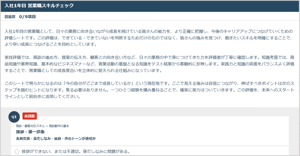 現在、評価回答画面ではすべての評価項目が1ページに表示される状態です。