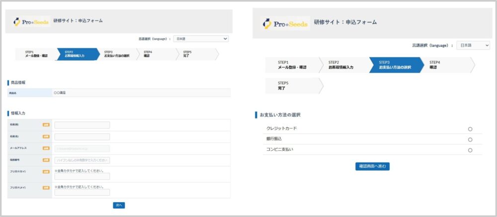左:お客様情報入力画面/右:お支払い方法選択画面