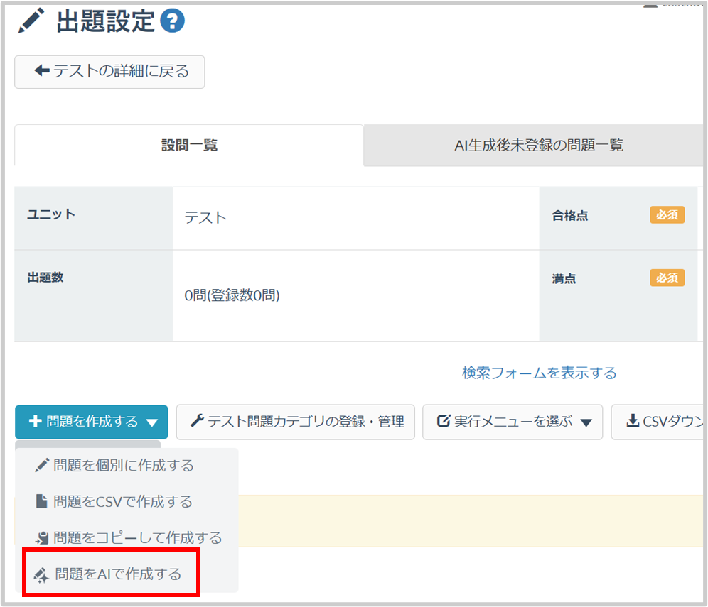 テストユニット>出題設定の「問題を作成する」で「問題をAIで作成する」を選択できるようになります。
