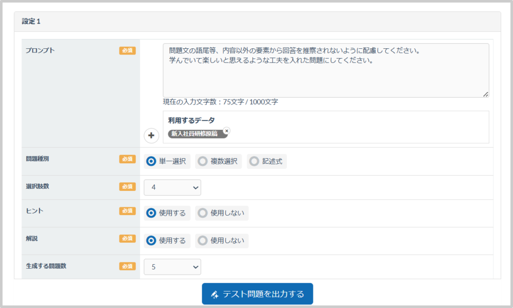 問題をAIで作成する場合には、プロンプトの書き込みや、ヒント・解説の使用有無、生成する問題数等を選択できます。