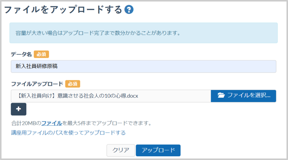 既に「講座用ファイルのアップロード」でアップロードしているデータも参照可能です。
