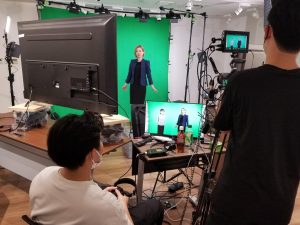 講師役の演者2名がグリーンバックスクリーンの前に立ち、掛け合いをしながら収録を進めました。