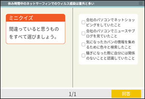 まず、一般社員、パート/アルバイトスタッフが日頃の業務の中で漏洩事故に巻き込まれてしまうケースをストーリー形式で学習します。そのあと、クイズが出題され、受講者自身が今回のケースで問題となったポイントは何かを考えます。最後に学習のポイントや過去実際にあった同様の事件の紹介をします。