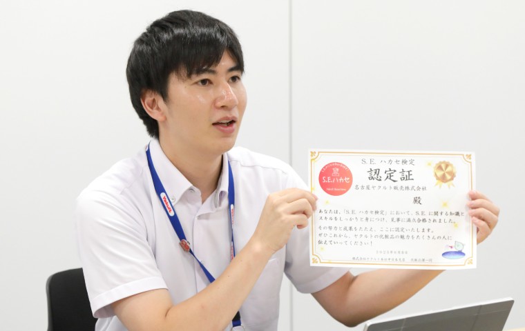2つ目は、販売会社社員のモチベーションアップです。これまではヤクルトレディ向けの企画を主に実施しており、社員向けの施策は不足していました。そこで試験を導入し、合格した社員にはバッジや賞状を授与することで、モチベーションアップにつなげたいと考えました。 また、化粧品販売70年という節目もあり、化粧品事業で大切にしている「自ら商品の良さを体感し、学んで知識をつけ、お客さまに商品の良さをお伝えすること」を徹底する新たな企画の一環として、オンライン試験を実施することにしました。